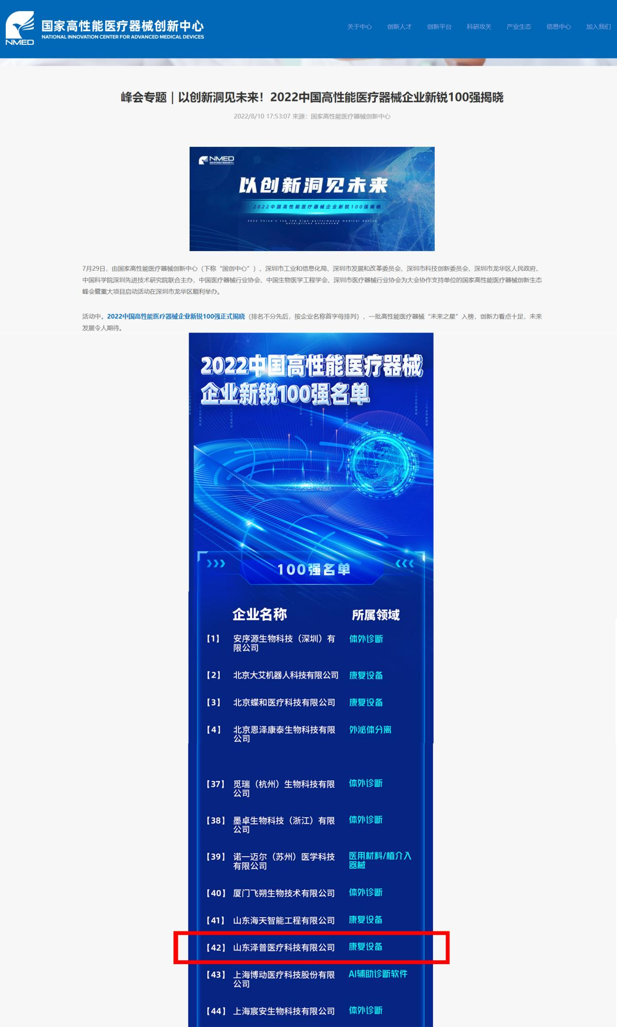 7月29日,由國家唯一高(gāo)性能醫(yī)療器(qì)械創新(xīn)中心聯合中國醫(yī)療器(qì)械行(xíng)業協會(huì)發布《2022中國高(gāo)性能醫(yī)療器(qì)械企業新(xīn)銳100強》榜單(排名不(bù)分先後,按企業名稱首字母排列)。榜單顯示,山東泽普醫(yī)療科(kē)技有限公司(sī)上榜“2022中國高(gāo)性能醫(yī)療器(qì)械百強新(xīn)銳企業”。